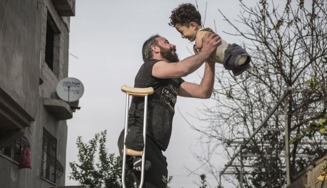 Ένας πατέρας που έχει χάσει το ένα του πόδι κρατά ψηλά στα χέρια τον γιο του που γεννήθηκε χωρίς κάτω και άνω άκρα λόγω συγγενούς διαταραχής που προκλήθηκε από τα φάρμακα που έπρεπε να πάρει η μητέρα του όταν αρρώστησε μετά την απελευθέρωση τοξικών αερίων κατά τη διάρκεια του πολέμου στη Συρία.