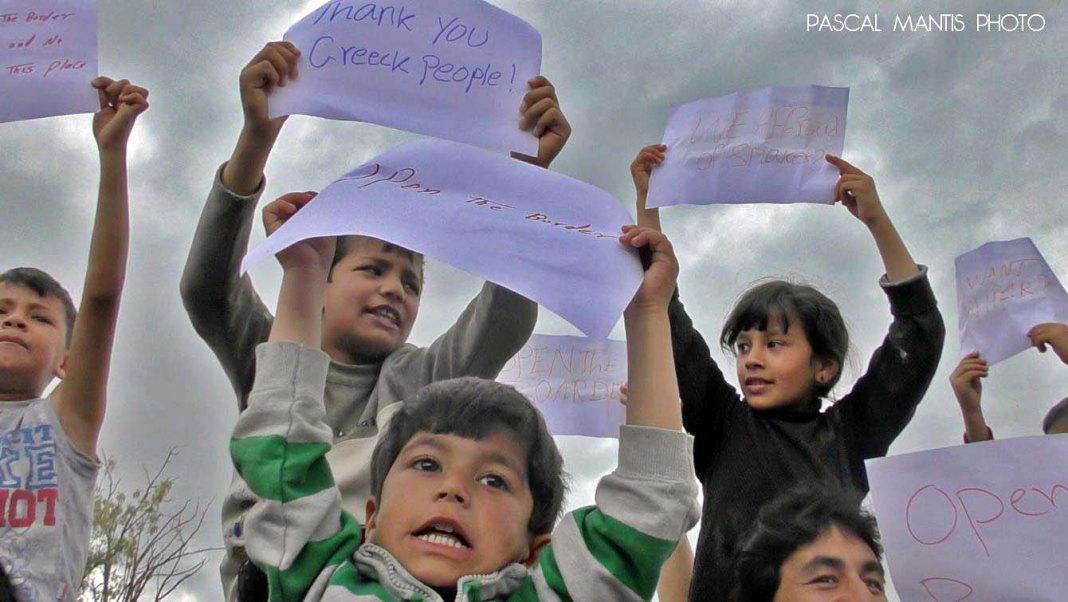 Γυναικόπεδα προσφύγων στο πλευρό τους με πλακάτ στα χέρια ευχαριστούν την Ελλάδα και ζητούν από την Ευρώπη να ανοίξει τα σύνορα.