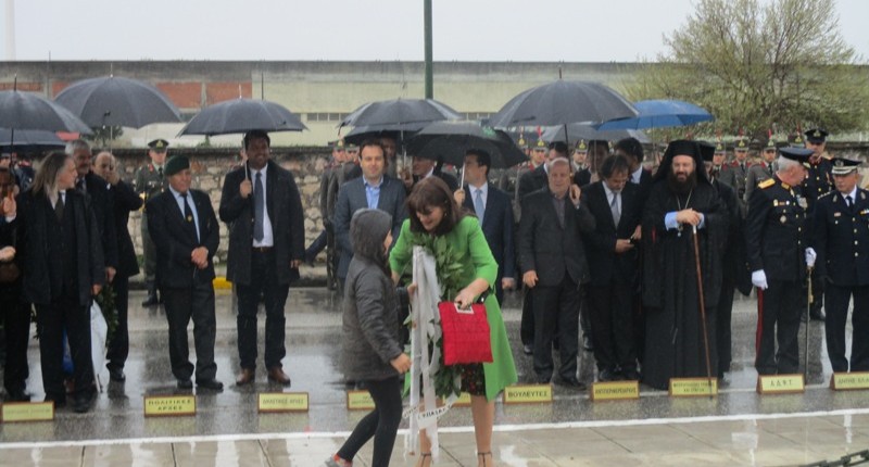 Η κ. Αναστασοπούλου αφού παρέλαβε το στεφάνι έπιασε από το χέρι την μαθήτρια και το τ κατέθεσε μαζί της στο μνημείο πεσόντων.