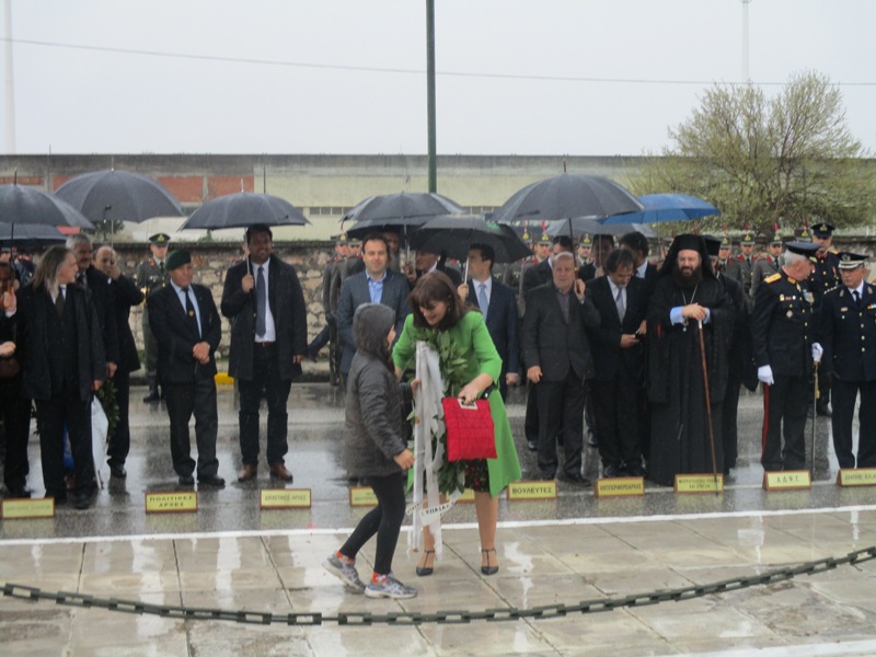 Η κ. Αναστασοπούλου αφού παρέλαβε το στεφάνι έπιασε από το χέρι την μαθήτρια και το τ κατέθεσε μαζί της στο μνημείο πεσόντων.