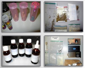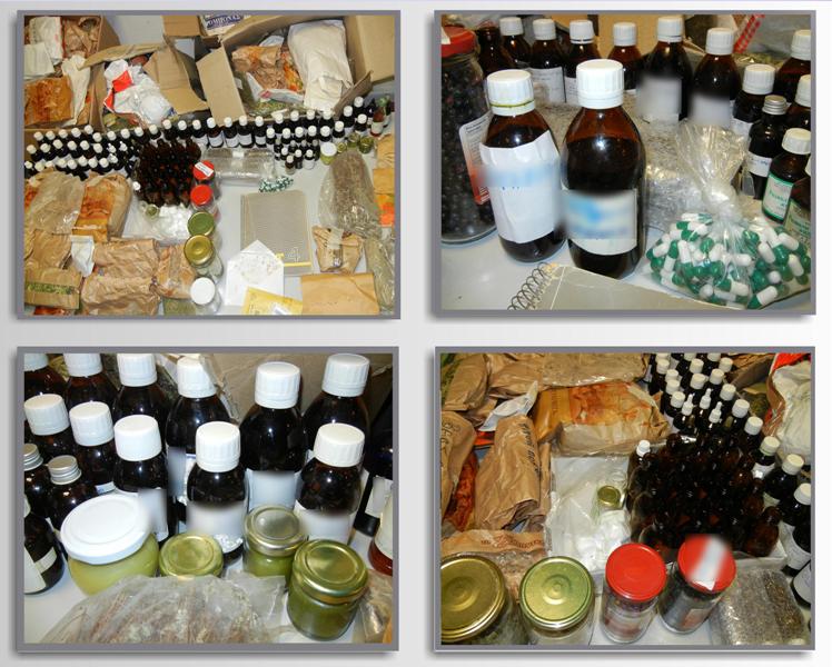 • πλήθος γυάλινων φιαλιδίων και συσκευασιών που περιείχαν ουσία (υγρή και σε σκόνη) αγνώστου χημικής συνθέσεως,