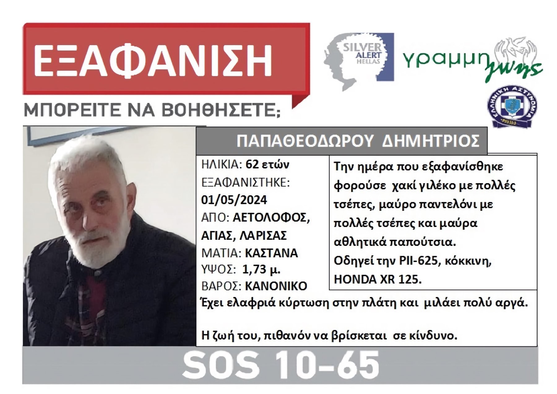 Άνδρας από τον Αετόλοφο Αγιάς εξαφανίστηκε πριν από δύο ημέρες. Όπως αναφέρει η Γραμμή Ζωής πρόκειται για τον «Παπαθεοδώρου Δημήτριο, 62 ετών, που εξαφανίστηκε από το σπίτι του, στον Αετόλοφο Αγιάς Λάρισας, την 01/05/24.