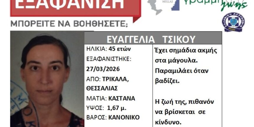 Συναγερμός έχει σημάνει για την εξαφάνιση της Ευαγγελίας Τσίκου, 45 ετών, η οποία αγνοείται από το μεσημέρι της 27ης Μαρτίου 2026 από το σπίτι της στα Τρίκαλα Θεσσαλίας.