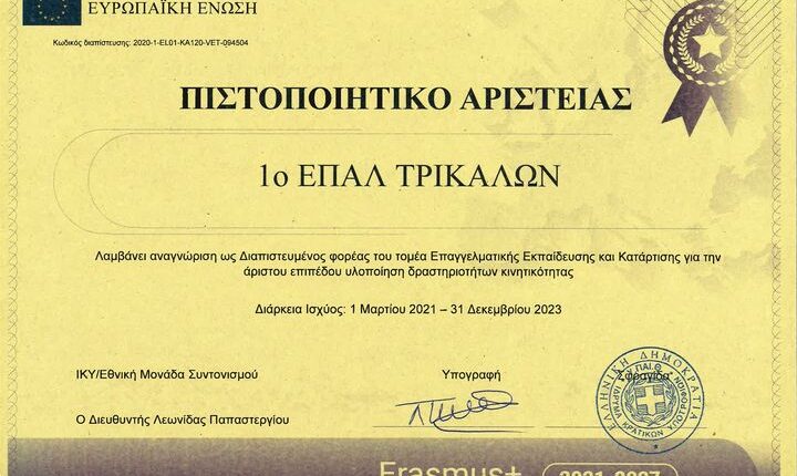Σήμερα το 1ο ΕΠΑΛ Τρικάλων έλαβε μία σημαντική διάκριση, το Πιστοποιητικό Αριστείας από την Ευρωπαϊκή Ένωση μέσω του ΙΚΥ, που είναι η Εθνική Μονάδα Συντονισμού των προγραμμάτων Erasmus+ στην Ελλάδα.