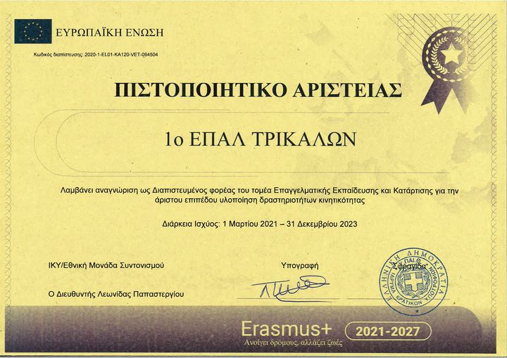 Σήμερα το 1ο ΕΠΑΛ Τρικάλων έλαβε μία σημαντική διάκριση, το Πιστοποιητικό Αριστείας από την Ευρωπαϊκή Ένωση μέσω του ΙΚΥ, που είναι η Εθνική Μονάδα Συντονισμού των προγραμμάτων Erasmus+ στην Ελλάδα.