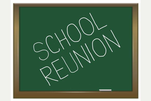 Illustration depicting a green chalkboard with a school reunion concept written on it.