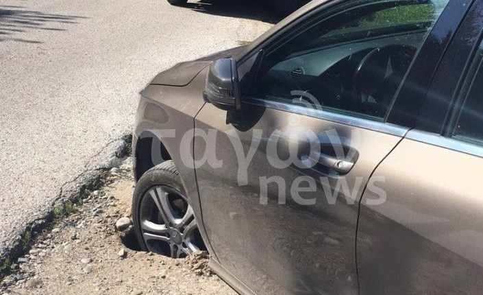 Τυχερός στην ατυχία του ο κ. Μπούρας καθώς η τρύπα ήταν μικρή με αποτέλεσμα να πέσει μέσα μόνο ο ένας τροχός.