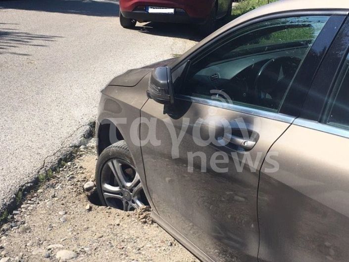 Τυχερός στην ατυχία του ο κ. Μπούρας καθώς η τρύπα ήταν μικρή με αποτέλεσμα να πέσει μέσα μόνο ο ένας τροχός.