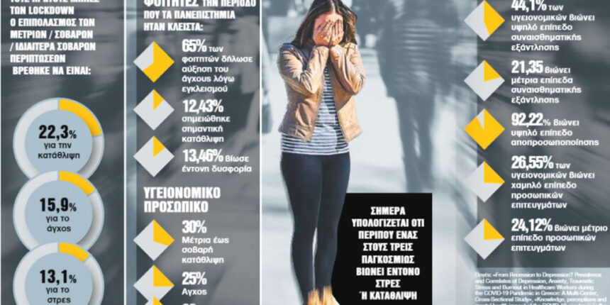 Οι ψυχικές διαταραχές μπήκαν ήδη από τους πρώτους μήνες της πανδημίας στο μικροσκόπιο με εκείνα τα πρώιμα αποτελέσματα να λειτουργούν σαν την κλειδαρότρυπα του μέλλοντος. Ερευνα που δημοσιεύτηκε τον Ιανουάριο του 2021 στην επιθεώρηση «Journal of Affective Disorders» με τίτλο «Αυτοαναφερόμενες μεταβολές στο άγχος, την κατάθλιψη και την αυτοκτονία κατά τη διάρκεια του lockdown της Covid-19 στην Ελλάδα», κατέληξε σε ιδιαίτερα ανησυχητικά συμπεράσματα. Το 9,31% του δείγματος εμφάνισε κλινική κατάθλιψη. Το 23,31% εκείνων που είχαν ιστορικό κατάθλιψης, υποτροπίασε.