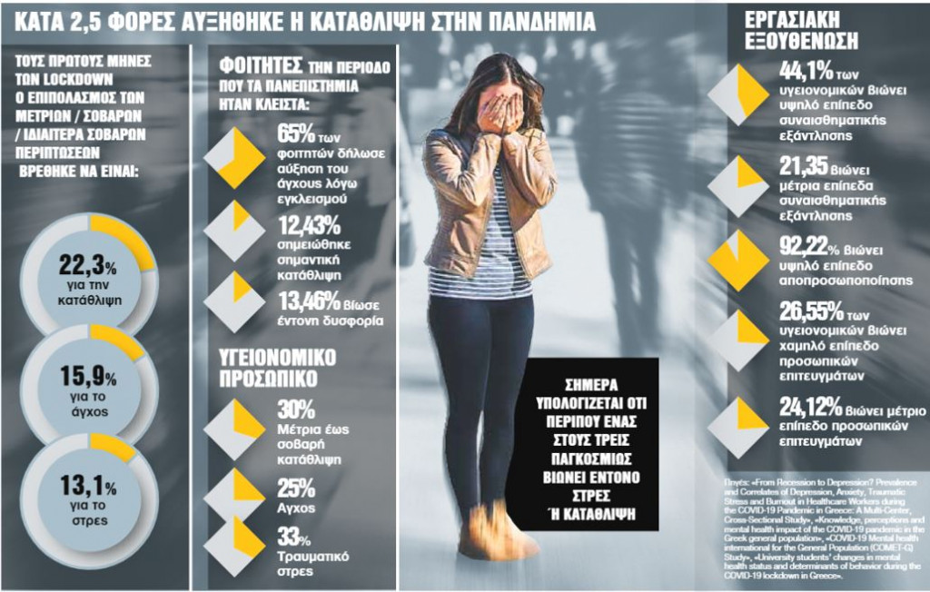 Οι ψυχικές διαταραχές μπήκαν ήδη από τους πρώτους μήνες της πανδημίας στο μικροσκόπιο με εκείνα τα πρώιμα αποτελέσματα να λειτουργούν σαν την κλειδαρότρυπα του μέλλοντος. Ερευνα που δημοσιεύτηκε τον Ιανουάριο του 2021 στην επιθεώρηση «Journal of Affective Disorders» με τίτλο «Αυτοαναφερόμενες μεταβολές στο άγχος, την κατάθλιψη και την αυτοκτονία κατά τη διάρκεια του lockdown της Covid-19 στην Ελλάδα», κατέληξε σε ιδιαίτερα ανησυχητικά συμπεράσματα. Το 9,31% του δείγματος εμφάνισε κλινική κατάθλιψη. Το 23,31% εκείνων που είχαν ιστορικό κατάθλιψης, υποτροπίασε.