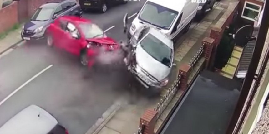 Στο βίντεο διακρίνεται ένα κόκκινο Peugeot 308, να πέφτει με μεγάλη ταχύτητα και να περιστρέφεται κατά 180 μοίρες σε αυτοκίνητα που βρισκόταν σε έναν στενό δρόμο στο Γκρίμσμπι στο Λίνκολνσάιρ, το βράδυ της Τετάρτης, μόλις 20 δευτερόλεπτα αφότου ένας ποδηλάτης πέρασε από εκείνο το σημείο.