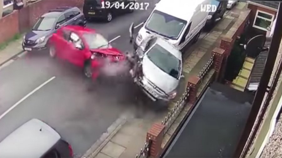 Στο βίντεο διακρίνεται ένα κόκκινο Peugeot 308, να πέφτει με μεγάλη ταχύτητα και να περιστρέφεται κατά 180 μοίρες σε αυτοκίνητα που βρισκόταν σε έναν στενό δρόμο στο Γκρίμσμπι στο Λίνκολνσάιρ, το βράδυ της Τετάρτης, μόλις 20 δευτερόλεπτα αφότου ένας ποδηλάτης πέρασε από εκείνο το σημείο.