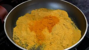 - Ρίχνουμε τη σκόνη σε ένα τηγάνι μαζί τον κουρκουμά, το αλάτι, το σκόρδο σκόνη, το μέλι, το νερό και ανακατεύουμε πάνω σε χαμηλή φωτιά για 4 με 5 λεπτά.