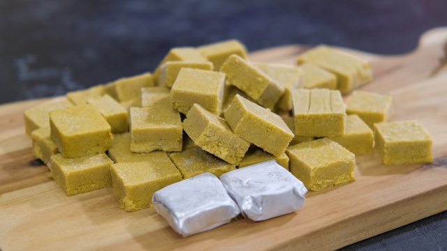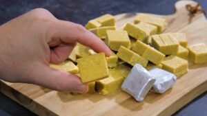 - Ξεφορμάρουμε και με ένα κοφτερό μαχαίρι κόβουμε σε ισα κομμάτια τους κύβους.