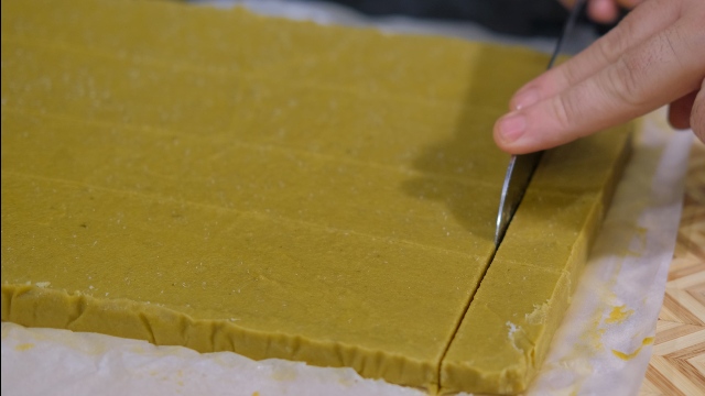 - Ξεφορμάρουμε και με ένα κοφτερό μαχαίρι κόβουμε σε ισα κομμάτια τους κύβους.