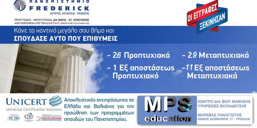 MPS educationΜΑΡΑΒΑΣ ΠΑΝΑΓΙΩΤΗΣ, αποκλειστικό πιστοποιημένο συνεργαζόμενο κέντρο στο νομό Τρικάλων της UNICERT αποκλειστικού αντιπροσώπου σε Ελλάδα και Βαλκάνια για τη προώθηση των προπτυχιακών και μεταπτυχιακών, δια ζώσης και εξ αποστάσεως, προγραμμάτων σπουδών του Πανεπιστημίου FREDERICK.