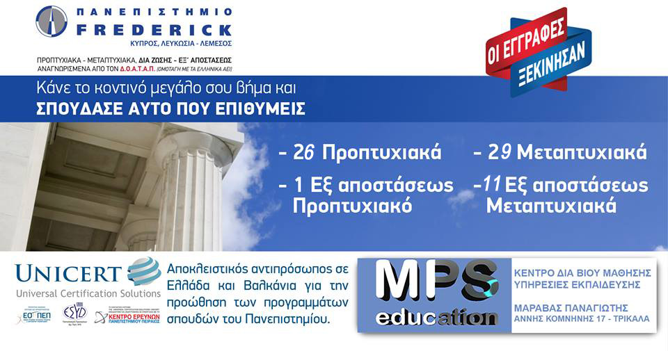 MPS educationΜΑΡΑΒΑΣ ΠΑΝΑΓΙΩΤΗΣ, αποκλειστικό πιστοποιημένο συνεργαζόμενο κέντρο στο νομό Τρικάλων της UNICERT αποκλειστικού αντιπροσώπου σε Ελλάδα και Βαλκάνια για τη προώθηση των προπτυχιακών και μεταπτυχιακών, δια ζώσης και εξ αποστάσεως, προγραμμάτων σπουδών του Πανεπιστημίου FREDERICK.