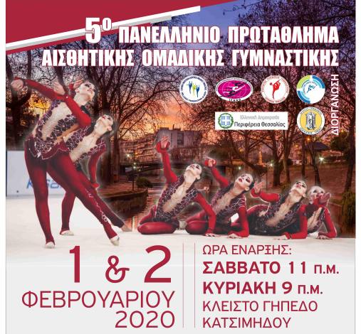 Η ΑΙΣΘΗΤΙΚΗ ΟΜΑΔΙΚΗ ΓΥΜΝΑΣΤΙΚΗΣ ΕΛΛΑΔΑΣ (Aesthetic Group Gymnastics of Greece) μαζί με τον ΣΥΛΛΟΓΟ ΡΥΘΜΙΚΗΣ ΓΥΜΝΑΣΤΙΚΗΣ ΟΛΥΜΠΙΑ ΤΡΙΚΑΛΩΝπροκηρύσσει το 5ο Πανελλήνιο Πρωτάθλημα Αισθητικής Ομαδικής Γυμναστικής όλων των ηλικιακών κατηγοριών.Οι αγώνες θα διεξαχθούν στα Τρίκαλα στις 1-2 Φεβρουαρίου 2020στο Κλειστό γυμναστήριο Κατσιμήδου.