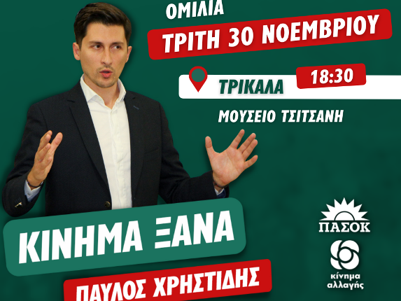 Στα Τρίκαλα θα βρίσκεται αύριο Τρίτη 30 Νοεμβρίου ο υποψήφιος για την προεδρία του ΚΙΝ.ΑΛ Παύλος Χρηστίδης.