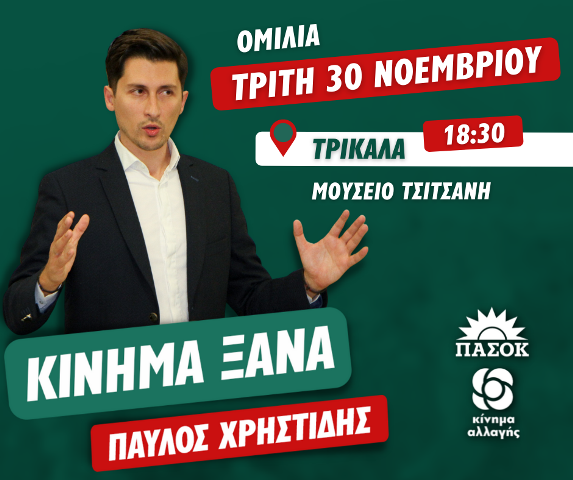 Στα Τρίκαλα θα βρίσκεται αύριο Τρίτη 30 Νοεμβρίου ο υποψήφιος για την προεδρία του ΚΙΝ.ΑΛ Παύλος Χρηστίδης.