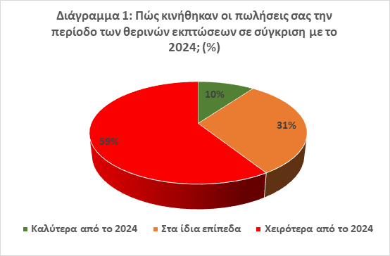 - Έξι στις 10 (59%) επιχειρήσεις στο λιανικό εμπόριο κατέγραψαν χειρότερες πωλήσεις κατά τη διάρκεια των θερινών εκπτώσεων συγκριτικά με πέρυσι, ενώ μόλις 1 στις 10, κυρίως πολύ μεγάλες επιχειρήσεις, κατέγραψαν θετικό πρόσημο (Διάγραμμα 1).