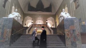 1η. Ο Πρωτοπρεσβύτερος Απόστολος Μαλαμούσης μαζί με την επιστήμονα κα Ιωάννα Παναγιώτου Μάμαλη στο ιστορικό Λουδοβίκειο Πανεπιστήμιο Μονάχου, όπου συνελήφθησαν από την Gestapo, και εκτελέστηκαν με τη λαιμητόμο τα αδέλφια Σολ (Scholl), μέλη της αντιστασιακής φοιτητικής οργάνωσης “Άσπρο Ρόδο” μετά από σπουδαία αντίσταση στο ναζιστικό καθεστώς.