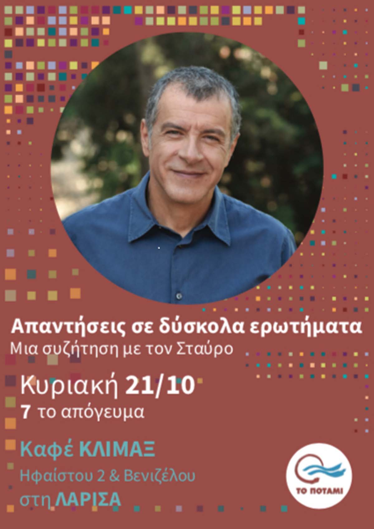 Στις 7 το απόγευμα της ίδιας μέρας ο Σταύρος Θεοδωράκης θα βρεθεί στη Λάρισα και θα συζητήσει με φίλους και στελέχη του Ποταμιού και πολίτες της πόλης στο «Καφέ Κλίμαξ» (Ηφαίστου 2 και Βενιζέλου).