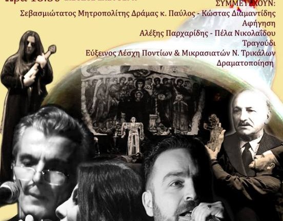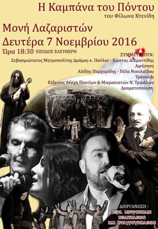 Ιδιαίτερη τιμή για την Εύξεινο Λέσχη Ποντίων & Μικρασιατών Ν. Τρικάλων η πρόσκληση για συμμετοχή της με τη θεατρική της ομάδα σε ένα έργο όπως “Η Καμπάνα του Πόντου” του Φίλωνα Κτενίδη. Πόσο μάλλον όταν τη διοργάνωση έχει η Ιερά Μητρόπολη Νεαπόλεως & Σταυρουπόλεως, όταν η παράσταση “ανεβαίνει” σε ένα χώρο όπως η Μονή Λαζαριστών στη Θεσσαλονίκη και όταν πλαισιώνεται από το Σεβασμιώτατο Μητροπολίτη Δράμας κ. Παύλο και τον Κώστα Διαμαντίδη στην αφήγηση, στο τραγούδι τον Αλέξη Παρχαρίδη και την Πέλα Νικολαΐδου, στη μουσική επιμέλεια και τη λύρα τον Μπάμπη Κεμανετζίδη, στα πλήκτρα το Χρήστο Κεμανετζίδη, στο λαούτο τον Νίκο Σιδηρόπουλο, στο κανονάκι το Θανάση Κουλεντιανό, την πολίτικη λύρα τον Παντελή Αγκιστρίδη και στα κρουστά το Γιάννη Γραικό και το Νίκο Δημητρίου.