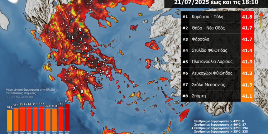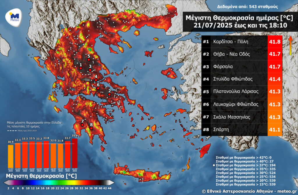 Σε Θεσσαλία, την Ανατολική Στερεά και την Πελοπόννησο καταγράφηκαν οι υψηλότερες θερμοκρασίες της Δευτέρας 21/07, σύμφωνα με το δίκτυο αυτόματων μετεωρολογικών σταθμών του Εθνικού Αστεροσκοπείου Αθηνών / meteo.gr. Η μέγιστη καταγράφηκε στην πόλη της Καρδίτσας και ήταν ίση με 41,8 βαθμούς Κελσίου.
