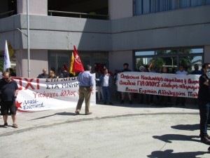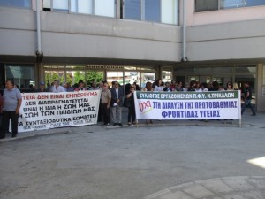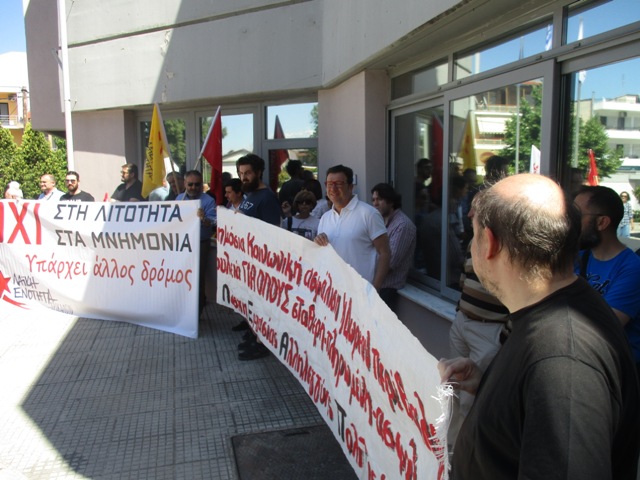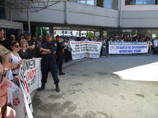 Όπως κατέγραψε το trikaladay, παρότι οι συγκεντρωθέντες μ;eλη του ΠΑΜΕ, της ΛΑ.Ε, της ΑΝΤΑΡΣΥΑ και άλλων κινήσεων περίμεναν να έρθουν τετ α τετ με τον υπουργό, αυτός εισήλθε από άλλη είσοδο στο Νοσοκομείο.