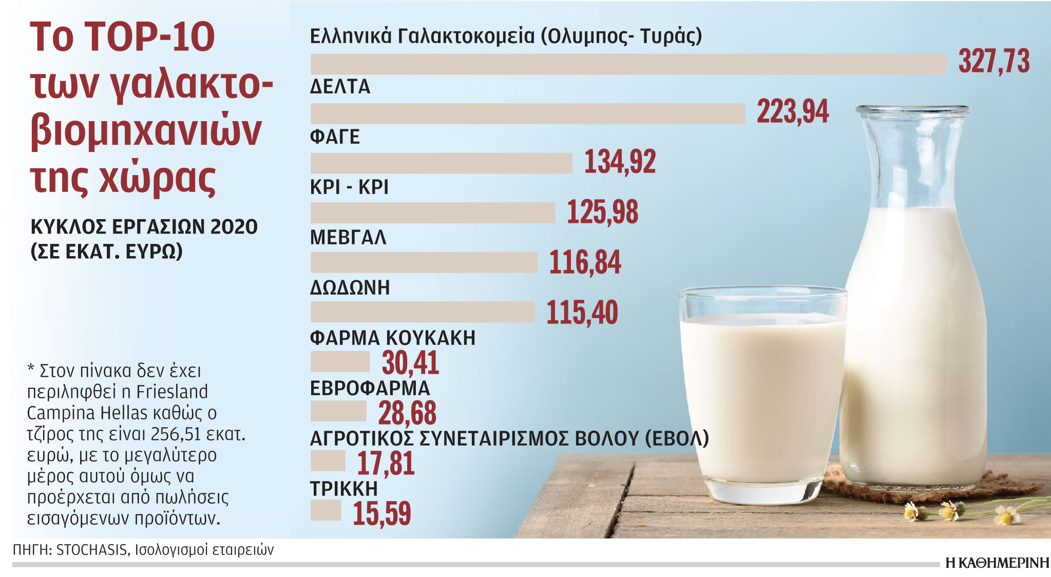 Αξίζει να σημειωθεί ότι στο Top 10 των γαλακτοβιομηχανιών της χώρας περιλαμβάνονται και δυο Τρικαλινές, με τα “ΕΛΛΗΝΙΚΑ ΓΑΛΑΚΤΟΚΟΜΕΙΑ” να είναι μακράν ο leader του κλάδου, ενώ η ΤΡΙΚΚΗ έχει καταφέρει και έχει αναρριχηθεί στη 10η θέση. Δείτε πως καταγράφονται τα στοιχεία στο γράφημα της ΚΑΘΗΜΕΡΙΝΗΣ: