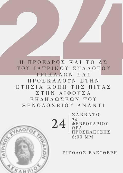 Την πίτα του θα κόψει ο Ιατρικός Σύλλογος Τρικάλων στις 24 Φεβρουαρίου 2024 στο ξενοδοχείο “Ανάντι”