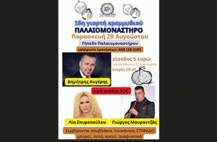 Την μεθεπόμενη Παρασκευή 29 Αυγούστου 2025, ο Σύλλογος Γυναικών Παλαιομοναστήρου, διοργανώνει για 15η φορά, την περίφημη “Γιορτή Κρεμμυδιού”, στο γήπεδο του χωριού.