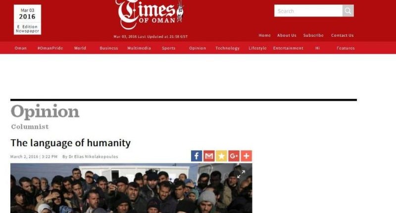 Μέχρι το μακρινό Ομάν έφτασε το γράμμα που έστειλε στους πρόσφυγες που φιλοξενήθηκαν στα Τρίκαλα, ο Δήμος Τρικκαίων. Η εφημερίδα Times of Oman αναδημοσίευσε, μέσω ενός Ελληνα, του δρ. Ηλία Νικολακόπουλου, που ζει και εργάζεται στην αραβική αυτή χώρα, το γράμμα των τρικαλινών στους πρόσφυγες. Στο κείμενο του κ. Νικολακόπουλου αναφέρεται η προσπάθεια των τρικαλινών και του Δήμου και ακολουθεί η μετάφραση του κειμένου στην αγγλόφωνη εφημερίδα.