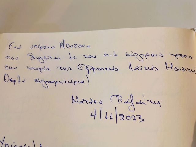 Λαϊκής Μουσικής. Θερμά συγχαρητήρια!». Νωρίτερα ξεναγήθηκε και στον χώρο του