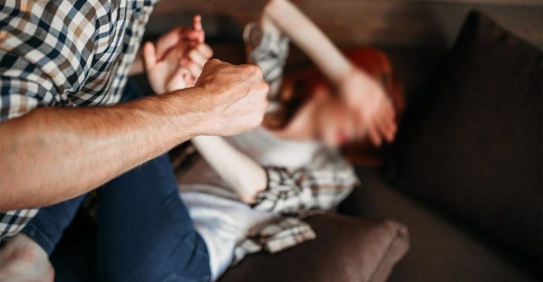 Angry husband beats his wife, domestic violence, quarrel, agressive couple fight. Man and woman in conflict. Problem relationship