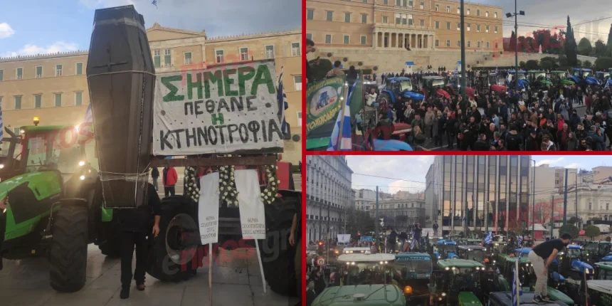 Το Σύνταγμα «πλημμύρισε» από τρακτέρ τα οποία έχουν παραταχθεί ακριβώς μπροστά από την Βουλή, έχοντας και ένα φέρετρο της κτηνοτροφίας στο οποίο αναγράφεται «θερμά συλλυπητήρια στους αγρότες». Παράλληλα, στο Σύνταγμα έχει στηθεί και η εξέδρα για τις ομιλίες.