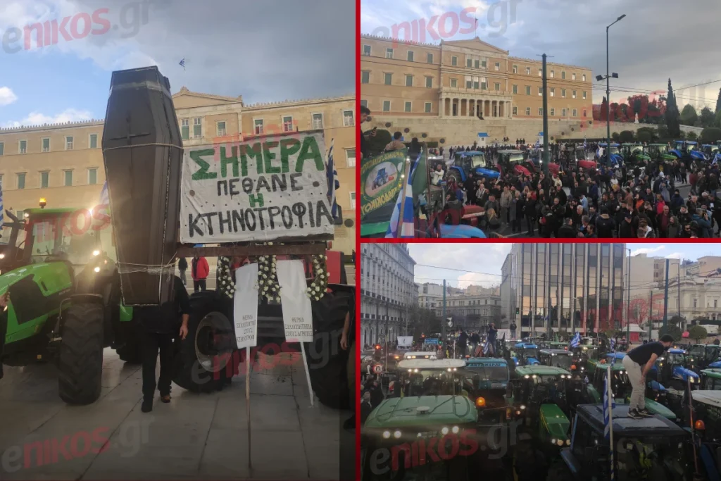 Το Σύνταγμα «πλημμύρισε» από τρακτέρ τα οποία έχουν παραταχθεί ακριβώς μπροστά από την Βουλή, έχοντας και ένα φέρετρο της κτηνοτροφίας στο οποίο αναγράφεται «θερμά συλλυπητήρια στους αγρότες». Παράλληλα, στο Σύνταγμα έχει στηθεί και η εξέδρα για τις ομιλίες.