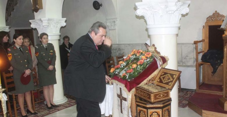 Ο κ. Καμμένος παραβρέθηκε σε θεία λειτουργία στον Ιερό Ναό Κοιμήσεως τη Θεοτόκου με την αρχιλοχία Βασιλική Πλεξίδα, η οποία είχε σωθεί από το τραγικό αεροπορικί δυστύχημα.