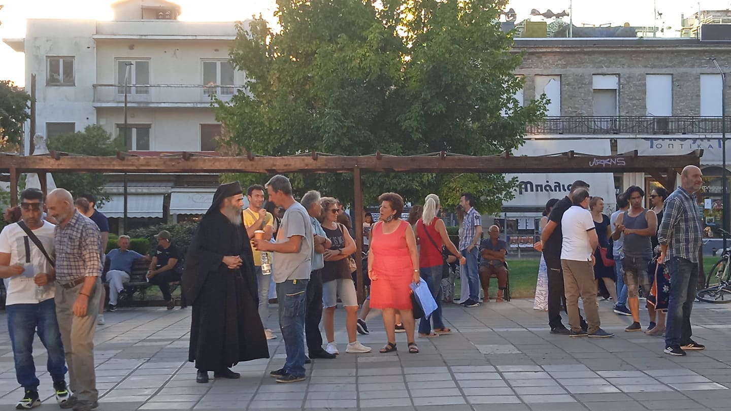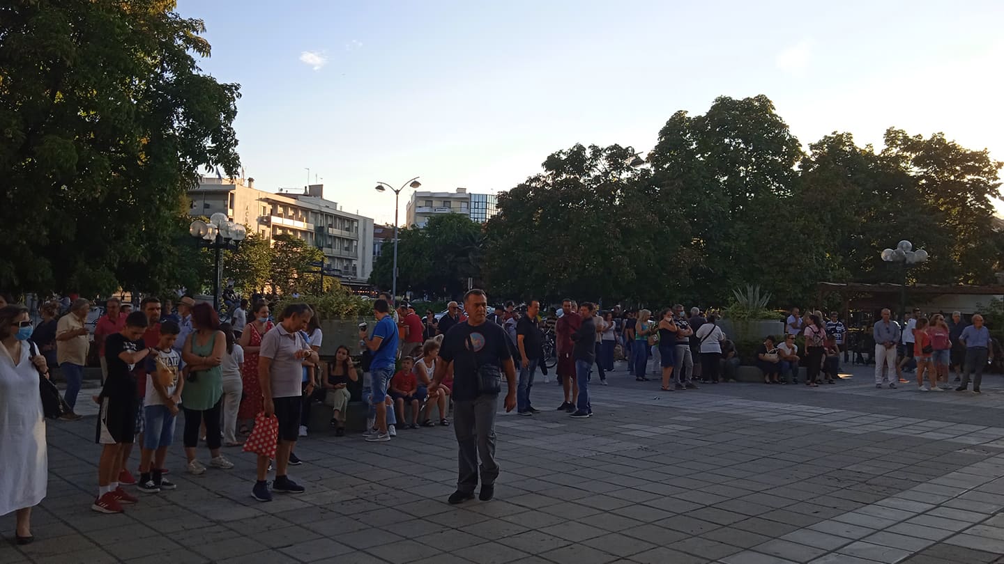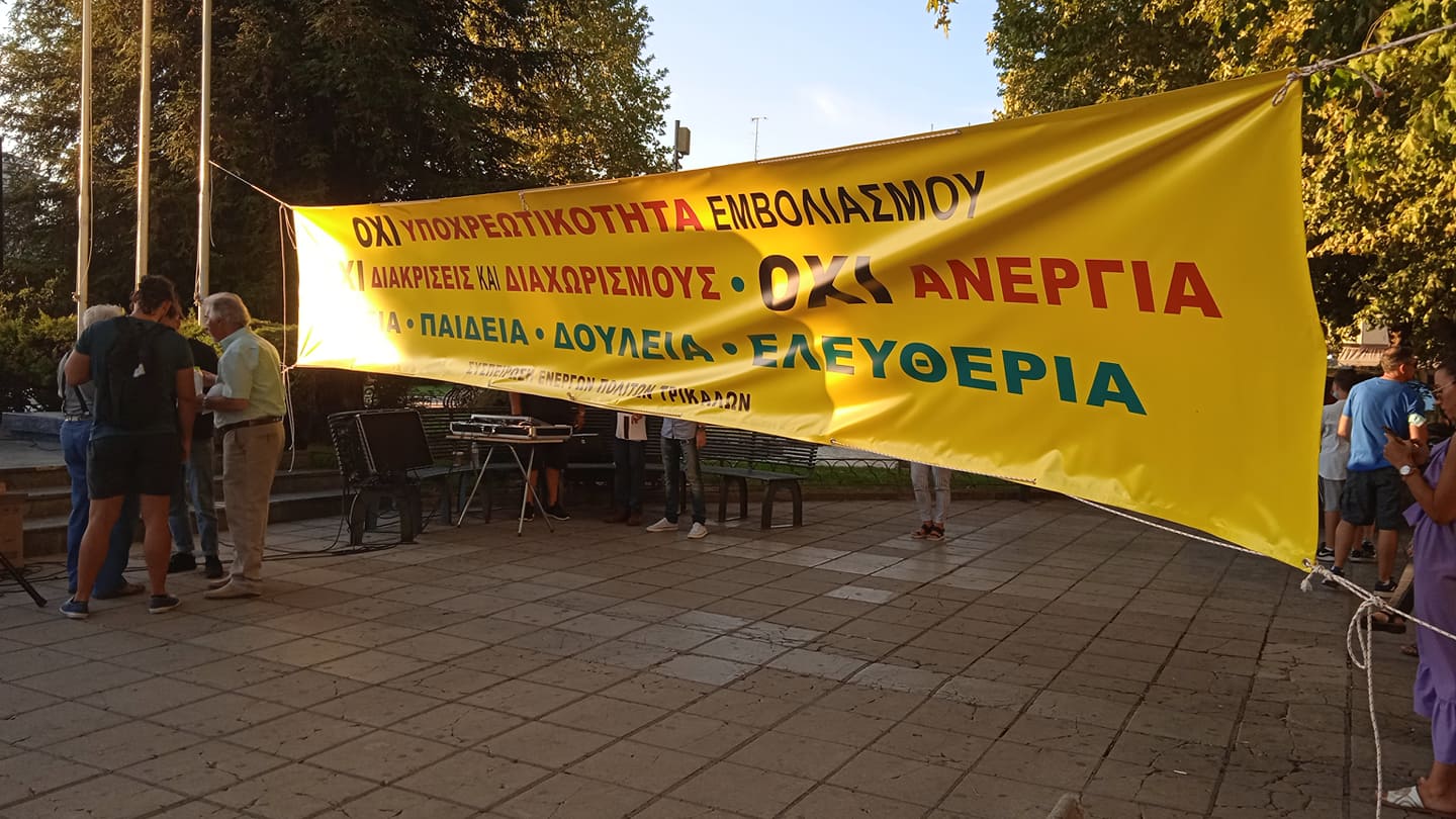 Συγκέντρωση πραγματοποίησαν χθες Κυριακή το απόγευμα στην κεντρική πλατεία των Τρικάλων, πολίτες που αντιτίθενται με την υποχρεωτικότητα στους εμβολιασμούς κατά τoυ covid-19.