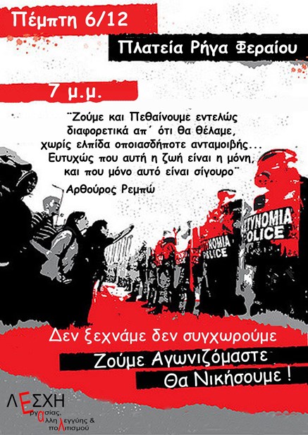 Η Λέσχη Εργασίας, Αλληλεγγύης και Πολιτισμού, καλεί μαθητικές κοινότητες, φοιτητικούς συλλόγους, σωματεία και συλλογικότητες, εργατικά σχήματα και συνδικαλιστικές παρατάξεις, πολιτικές οργανώσεις και μετωπικά κινήματα, τους εργαζόμενους και εργαζόμενες, τον κόσμο της επισφάλειας και της ανεργίας, τη νεολαία, σε συγκέντρωση για τη συμπλήρωση 10 χρόνων από τη δολοφονία του Αλέξανδρου Γρηγορόπουλου, στην πλατεία Ρήγα Φεραίου, την Πέμπτη 6/12 στις 7 μ.μ. και σε πορεία στο κέντρο της πόλης.