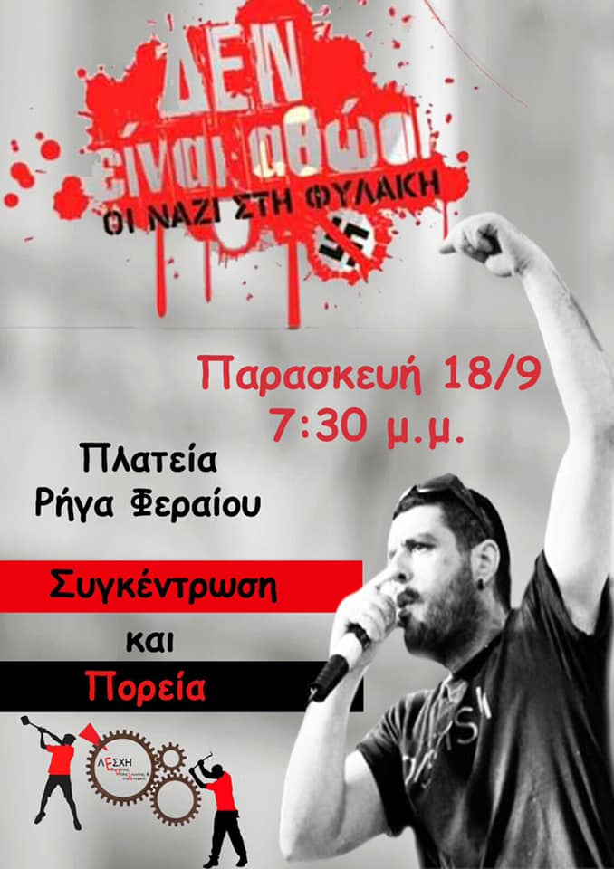 ΛΕΣΧΗ ΕΡΓΑΣΙΑΣ, ΑΛΛΗΛΕΓΓΥΗΣ & ΠΟΛΙΤΙΣΜΟΥ : Ο ΠΑΥΛΟΣ ΦΥΣΣΑΣ ΖΕΙ, ΟΙ ΝΑΖΙ ΣΤΗ ΦΥΛΑΚΗ! ΟΛΕΣ – OΛΟΙ ΣΤΙ ΣΥΓΚΕΝΤΡΩΣΗ ΠΑΡΑΣΚΕΥΗ 18/9, 7: 30 μ.μ., ΠΛΑΤΕΙΑ ΡΗΓΑ ΦΕΡΑΙΟΥ.