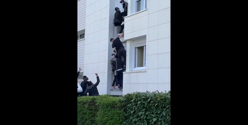 Σκαρφαλώνουν στα πρεβάζια, φτιάχνουν μιαν ανθρώπινη σκάλα και κατεβάζουν από το φλεγόμενο διαμέρισμα την οικογένεια και το μωρό. Πρόκειται για νεαρά παιδιά που έχουν σκαρφαλώσει μέχρι το μπαλκόνι της οικογένειας, με την πράξη τους να προκαλεί συγκίνηση.