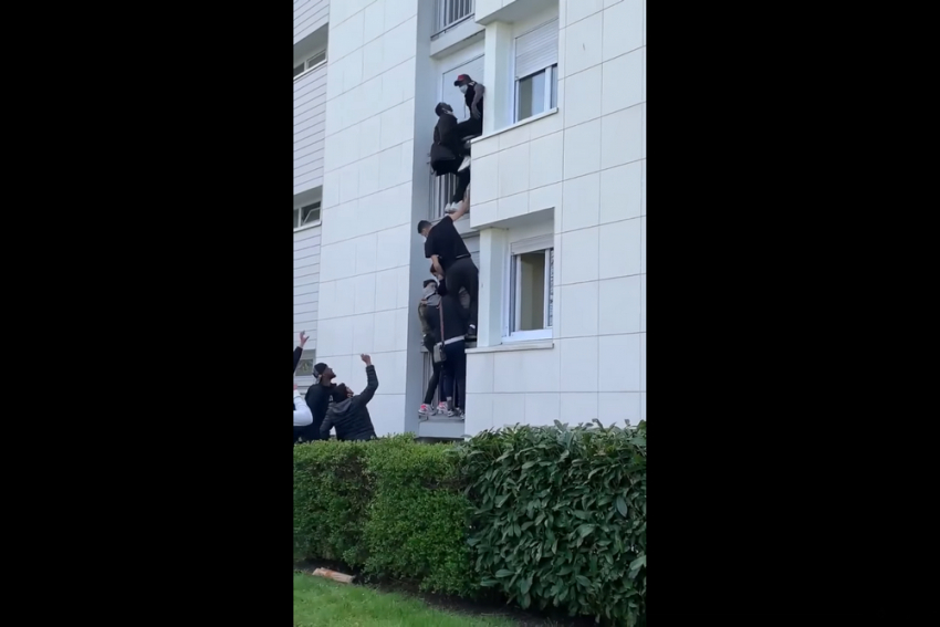 Σκαρφαλώνουν στα πρεβάζια, φτιάχνουν μιαν ανθρώπινη σκάλα και κατεβάζουν από το φλεγόμενο διαμέρισμα την οικογένεια και το μωρό. Πρόκειται για νεαρά παιδιά που έχουν σκαρφαλώσει μέχρι το μπαλκόνι της οικογένειας, με την πράξη τους να προκαλεί συγκίνηση.