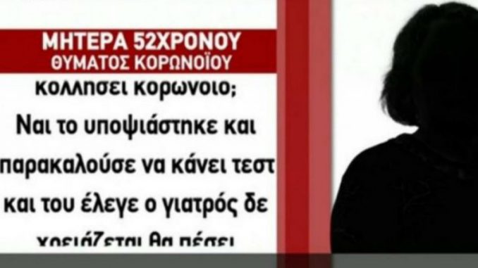 Μάλιστα, ο άτυχος άνδρας απευθύνθηκε σε ιδιώτη γιατρό ο οποίος όπως φαίνεται τον καθησύχαζε, όπως αναφέρει η μητέρα του. «Υποψιαζόταν ότι έχει κολλήσει κορωνοϊό και παρακαλούσε να κάνει τεστ και του έλεγε ο γιατρός δε χρειάζεται θα πέσει ο πυρετός, θα πέσει ο πυρετός» είπε η μητέρα του.