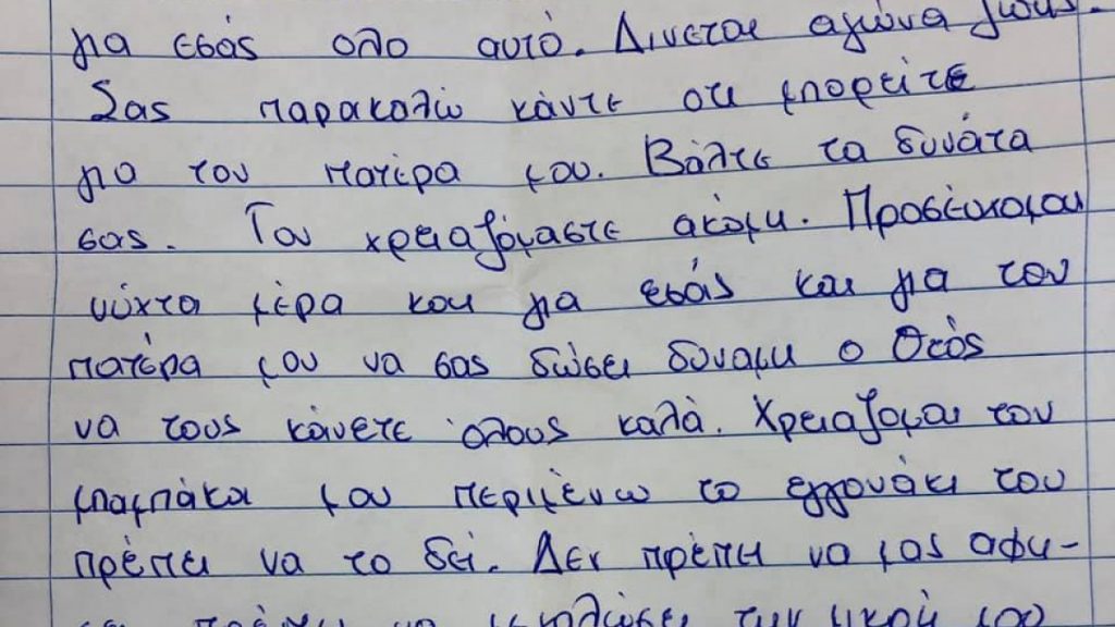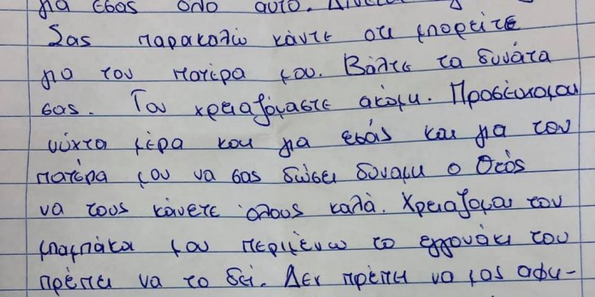 «Χρειάζομαι τον μπαμπάκα μου, περιμένω το εγγονάκι του, πρέπει να το δει. Δεν πρέπει να μας αφήσει, πρέπει να μεγαλώσει την μικρή μου αδερφή, κάντε ότι μπορείτε» είναι ένα απόσπασμα από γράμμα κόρης ασθενώς με Covid-19 που νοσηλεύεται στη ΜΕΘ του νοσοκομείου.