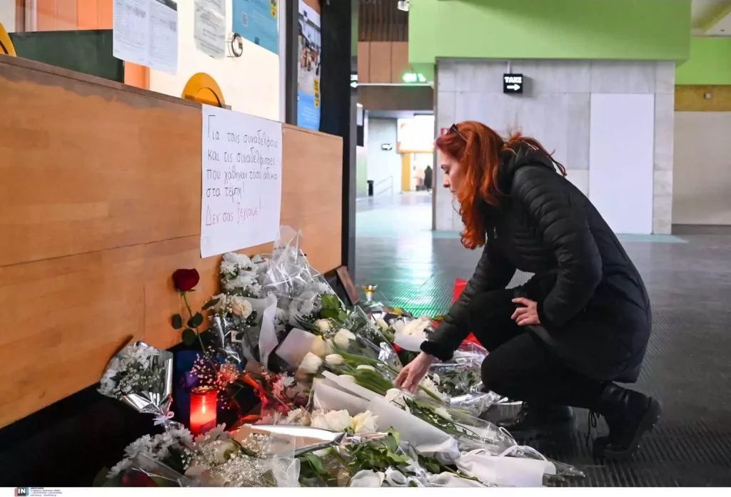 Η είσοδος των γραφείων του ΟΣΕ έχει γεμίσει με λουλούδια και γράμματα με μηνύματα για όσους χάθηκαν μα και για εκείνους που αγνοούνται ακόμα από τη μοιραία σύγκρουση των δυο τρένων στα Τέμπη.