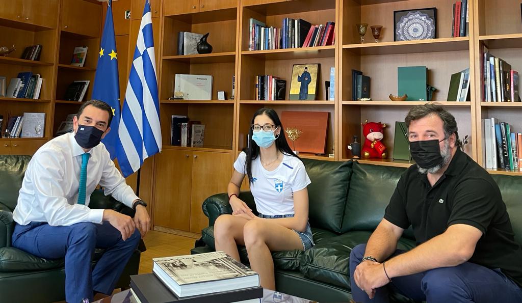 Ο Κώστας Σκρέκας υποδέχτηκε και συνεχάρη στο Υπουργείο Περιβάλλοντος και Ενέργειας την Τρικαλινή πρωταθλήτρια του τάε κβον ντο, Φανή Τζέλη, μαζί με τον προπονητή της Νίκο Παϊταρίδη.