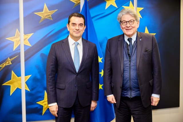 Ο Υπουργός Ανάπτυξης, Κώστας Σκρέκας, συναντήθηκε την Τετάρτη (6 Μαρτίου 2024) στις Βρυξέλλες, στο πλαίσιο της Υπουργικής Συνόδου του Συμβουλίου Ανταγωνιστικότητας με τον Επίτροπο Εσωτερικής Αγοράς, Thierry Breton τον οποίο προσκάλεσε να έρθει στη χώρα μας να επισκεφθεί βιομηχανικές μονάδες που προωθούν την πράσινη μετάβαση και δραστηριοποιούνται σε κρίσιμους τομείς.