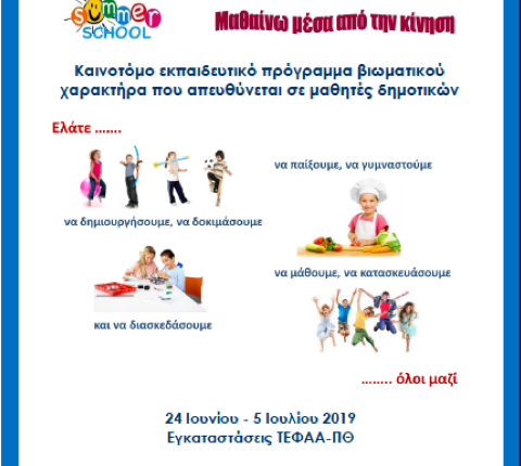 Συνεχίζονται οι εγγραφές αλλά και οι προετοιμασίες για το 4oSummerSchoolτου ΤΕΦΑΑ του Πανεπιστημίου Θεσσαλίας με τίτλο «Μαθαίνω μέσα από την κίνηση» που θα πραγματοποιηθεί από τις24 Ιουνίου έως τις 5 Ιουλίου 2019(10 ημέρες) στις εγκαταστάσεις του ΤΕΦΑΑ στα Τρίκαλα.